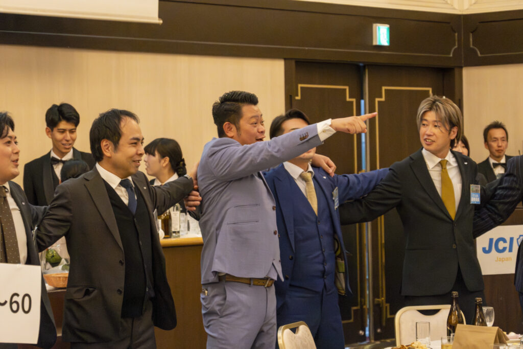 懇親会では、鎌ケ谷青年会議所50周年記念式典・祝賀会のPR動画を上映し、開催のご案内とともにシュプレヒコールを行いました。当日は、緑色の法被に、オレンジ色のネクタイ・スカーフを身にまとい、50周年イヤーを象徴する装いで参加しました。
